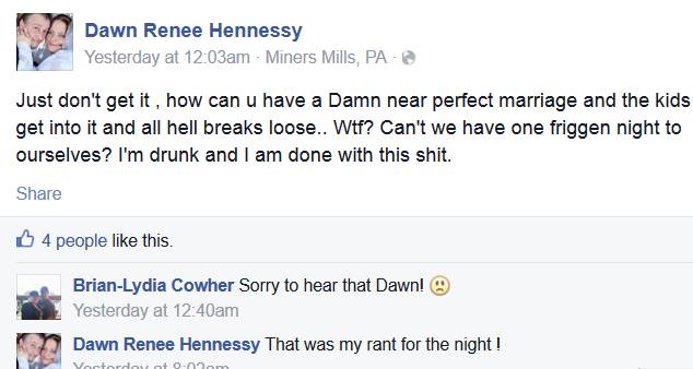 Interestingly, the comments made by the father about Aaron's mom (Dawn Hennessy, she was Dawn Daniels when she helped write Aaron's book, but dropped Daniels now that he is a charged pedophile) being a drunk were backed up just this week by.... Dawn Hennessy... on her own Facebook page with this post!