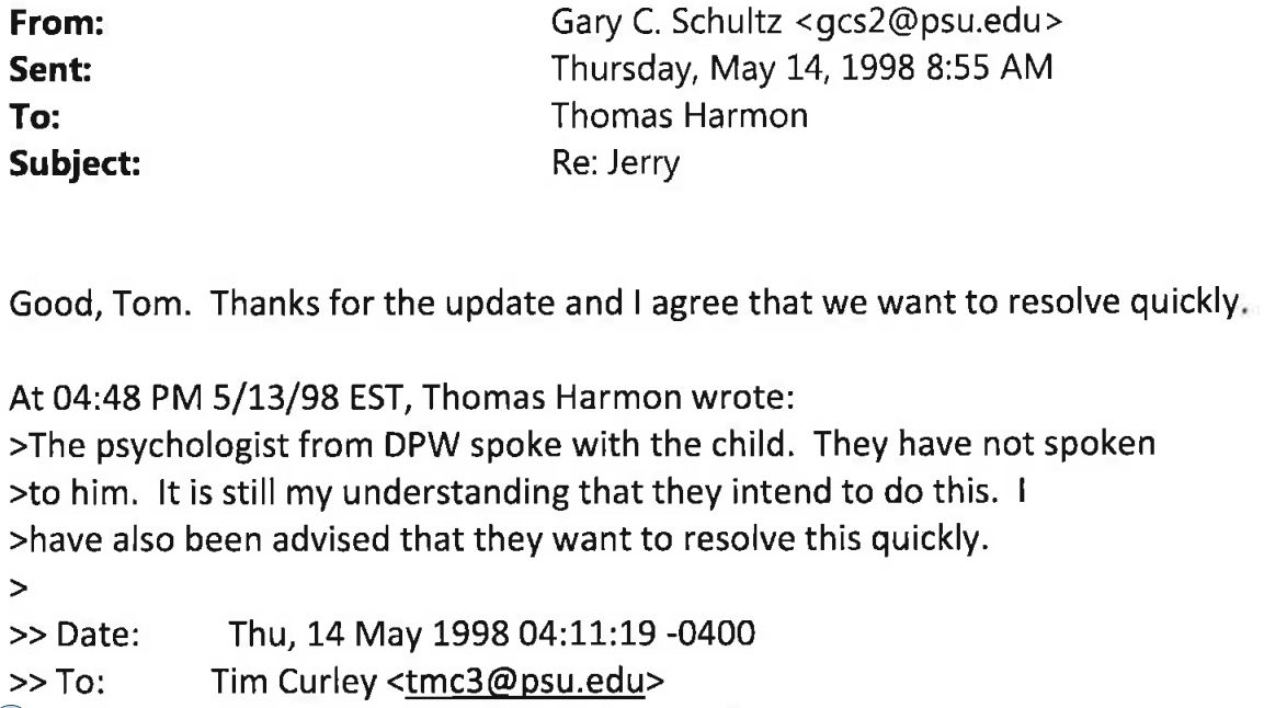 This email is also from Gary Schultz's computer from Gary Schultz to Tom Harmon with a further email to Tim Curley at the bottom. So this is not about different computers or different email programs.