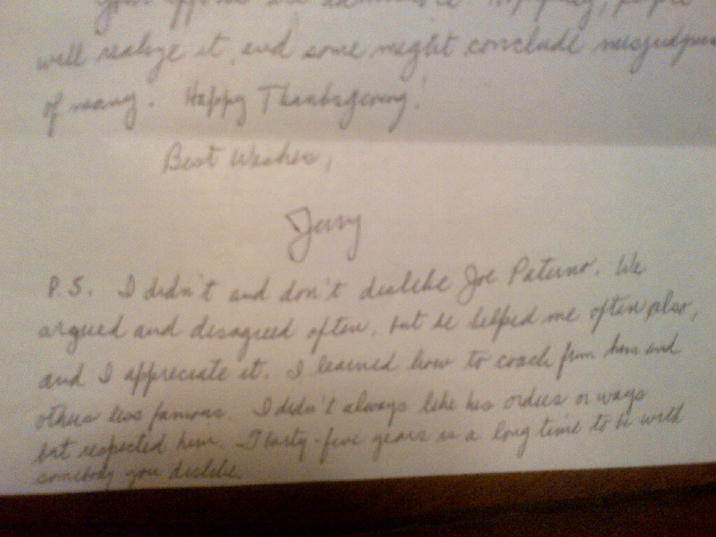 As one of the far-too-many-to-overcome “Perfect Storm” elements of this story, communication with Sandusky in a “SuperMax” prison is extremely difficult and makes the days of the Pony Express seem efficient by comparison. Consequently, it took almost two weeks before Jerry finally sent Dottie a written response and she was able to email a scanned version to me.